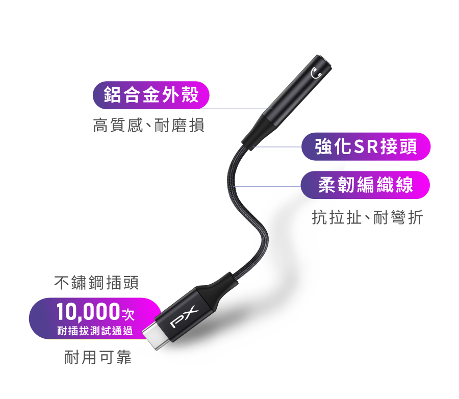 高質感鋁合金外殼結合不鏽鋼插頭,通過耐插拔10000次測試,搭配柔韌編織線,強化SR接頭,抗拉扯、耐彎折,不僅好看,更經得起日常使用考驗。