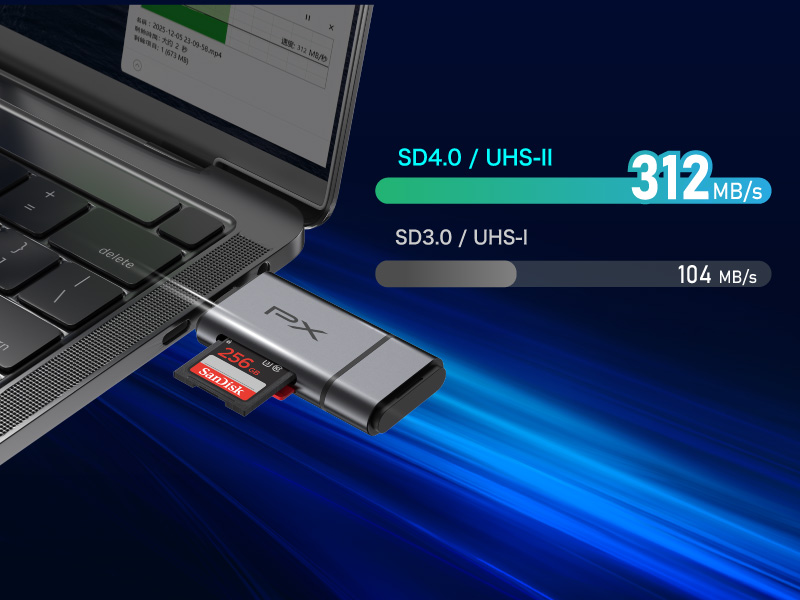 支援SD/TF 4.0高速規格,理論傳輸速度可達312MB/s,大幅縮短等待時間,大量照片、影片快速匯入,創作流程更順暢。
