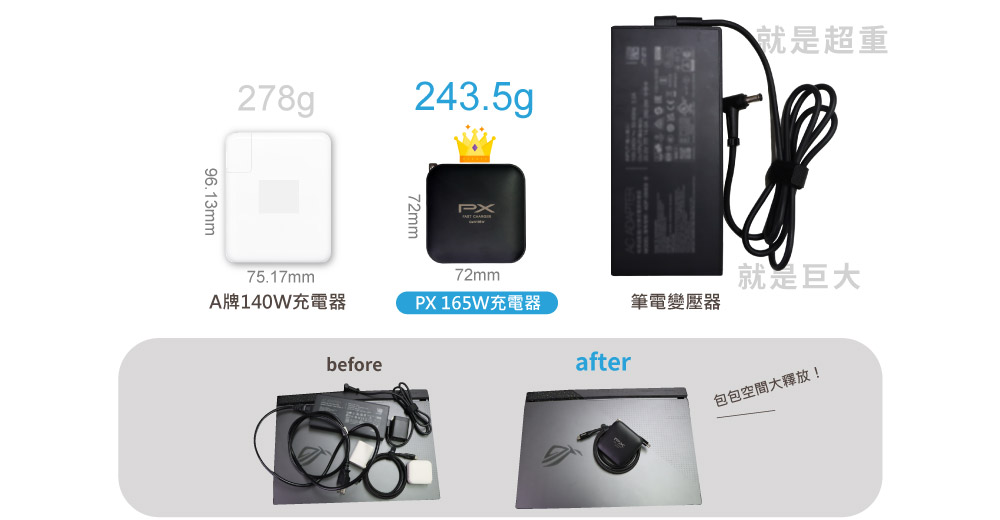 體積精簡卻能輸出大火力,比一般筆電變壓器更輕更小,出門隨身帶著走,戰力滿格零負擔。